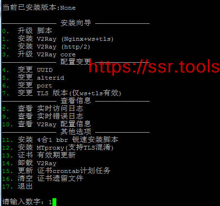 2.出现下图界面时,输入数字1回车,开始安装V2Ray: