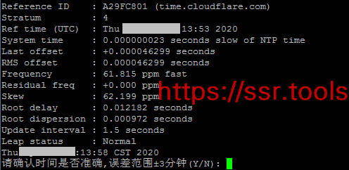 3.接下来脚本会自动为服务器对时,因为V2Ray对准确时间的要求很高。出现下图界面时,输入Y回车继续: