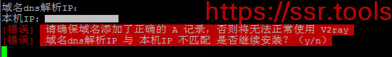 1.一键脚本安装过程中,出现错误提示:域名DNS解析IP 与本机IP 不匹配,是否继续安装?