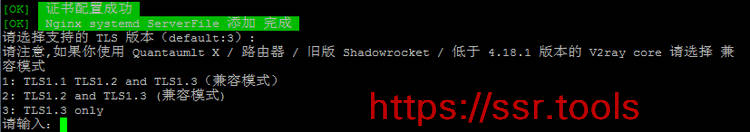 6.出现下图界面时,选择数字1回车,选择TLS兼容模式,以免部分客户端不兼容TLS1.3。