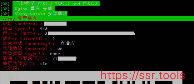 7.安装完成后,会出现下图界面,列出V2Ray的各项连接参数,以及连接二维码和Vmess链接,建议选中Vmess链接即可复制,复制后保存至本地电脑,以备V2Ray客户端连接。