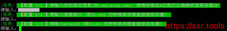 2.脚本运行后会自动开始安装,安装过程中需要依次填写域名、端口、alterID,如下图所示。