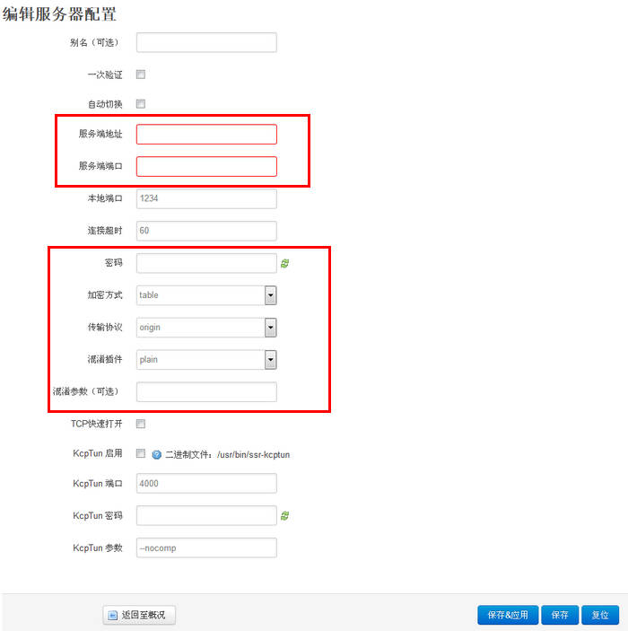2.在接下来的界面中,如下图,填入SSR服务端设置好的各项参数,红框内建议填写,红框以外默认即可。