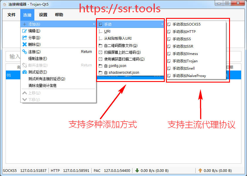 依次点击主界面的 连接——添加,即可选择适合自己的添加方式,Trojan-Qt5支持的代理添加方式包括: