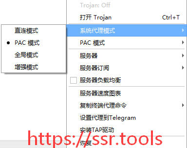 右键点击系统托盘中的Trojan-Qt5图标,在系统代理模式菜单下,可以找到: