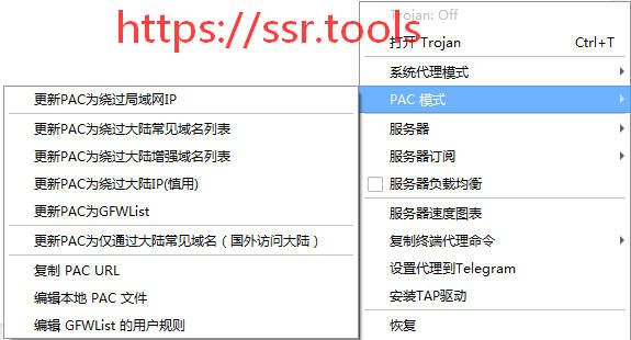 需要修改的话,右键点击系统托盘的Trojan-Qt5图标,在PAC模式菜单下,可以找到: