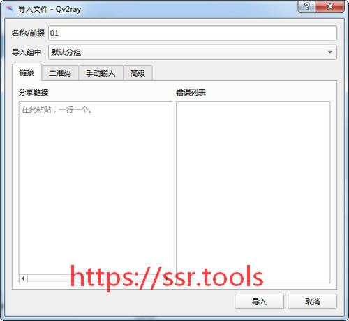 2.点击新建按钮后,即可进入下图的导入文件界面,其中的名称/前缀栏,可以任意填写。Qv2ray提供以下4种方式来添加代理服务器: