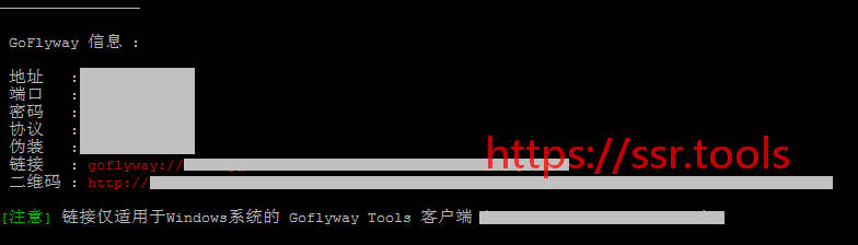 7.以上各项设置完成后,Goflyway会自动完成安装过程,目前最新版本为v2.0。安装成功后的界面如下图所示,会提供Goflyway的各项连接参数。