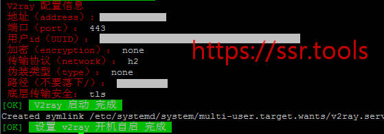 4.VLESS+http/2+Fallback模式安装完成后,会出现如下提示,列出V2ray客户端的连接参数。