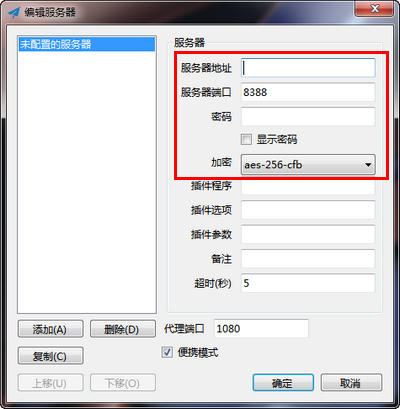 2.在弹出的编辑服务器窗口中,填入Shadowsocks服务器的连接信息,如下图所示,红框内为必填项,填写完成后点击确定保存。