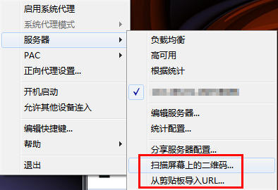 如果你有Shadowsocks服务器的连接二维码或者SS链接,那么也可以右键点击任务栏的小飞机图标,选择扫描屏幕上的二维码,或者从剪贴板导入URL这两种方式添加服务器。
