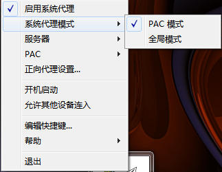 3.打开Shadowsocks客户端,右键点击任务栏小飞机,将系统代理模式设置为PAC模式。