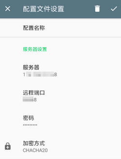 3.服务器配置界面如下图所示,分别填入Shadowsocks服务器的IP、端口、连接密码和加密方式,填写完成后,点击右上角的对号保存。如果点击对号左侧的垃圾筒标志,则可以删除当前服务器。